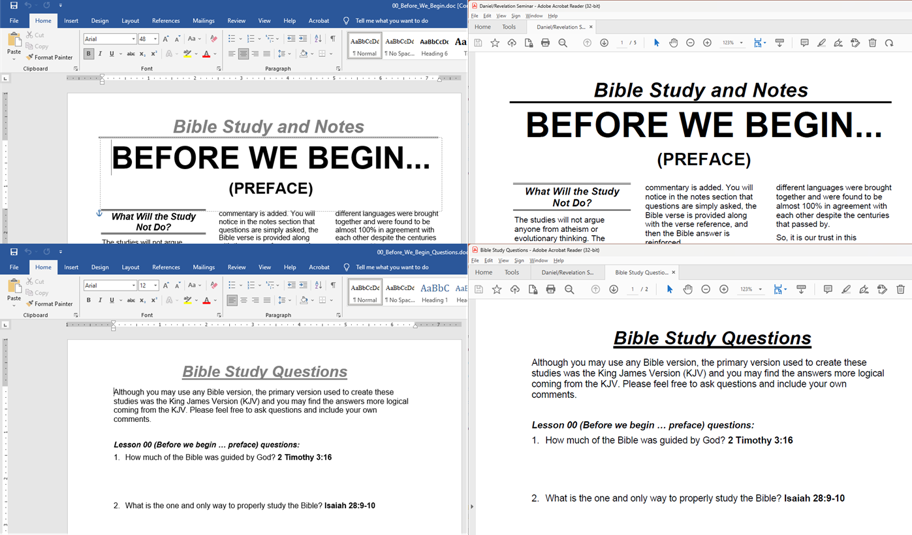 We provide 26 lessons plus 6 additional studies covering, in a progressive way, all of the basic doctrines of the Bible. In both Word and PDF format, we provide downloadable studies to start off with prophecy, leading into the doctrines, that hopefully leads the student into full understanding of the Bible truth and His church. It is highly recommended that a student progress sequentially as certain studies will not make sense if a prior lesson is not completed first. We provide both a study as well as a review sheet for students to write their answers to the ten or so questions asked and give it back to the instructor for assessment.